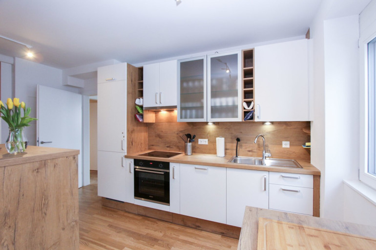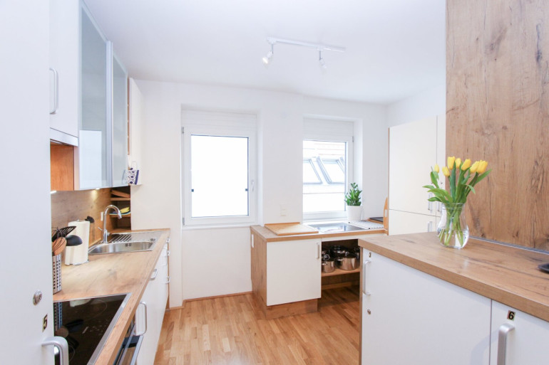 Der Co-Living Bereich ist mit einer großen Küche samt Inventar (Geschirr, Töpfe, etc.) ausgestattet. Jede Wohneinheit verfügt über einen eigenen Kühlschrank und ein versperrbares Lebensmittelkästchen. Der Woh- u. Essbereich sowie die Terrasse sind liebevoll und modern eingerichtet.