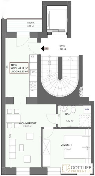 Man betritt diese Wohnung und gelangt unmittelbar in den gemütlichen ca. 28,02 m² großen Wohn-Ess-Bereich mit direktem Ausgang auf die ca. 2,80 m² große Loggia. Vom Wohn-Ess-Bereich erreicht man das ca. 11,70 m² große Schlafzimmer und das Duschbad mit Toilette.