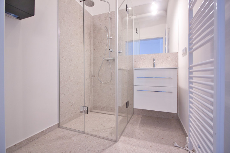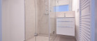 - Badezimmer mit Dusche, Waschtisch und Waschmaschinenanschluss