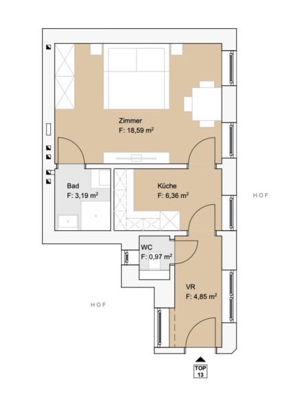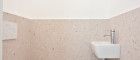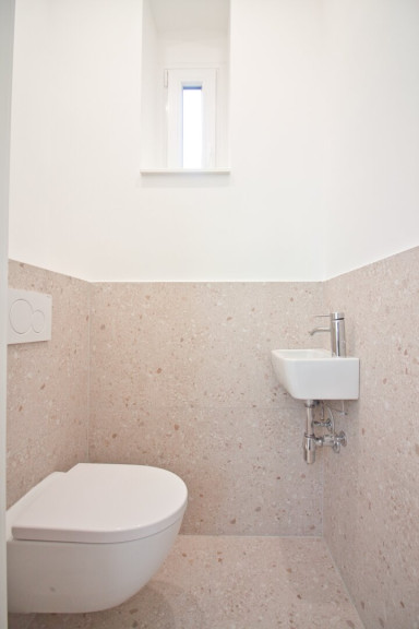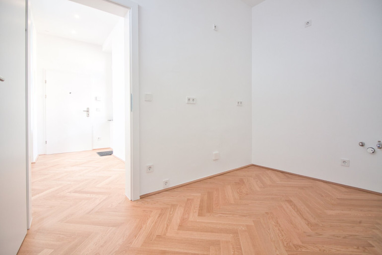 Der großzügige, helle Vorraum bietet ausreichend Platz für Garderobe und zum Ankommen. Direkt neben dem Eingang befindet sich ein separates WC mit Handwaschbecken. Vom Vorraum aus betritt man die gut geschnittene, separate Küche. Das angrenzende, südseitige Wohn-/Schlafzimmer mit knapp 19 m² lässt keine Wünsche offen: Platz für einen Essbereich und für eine gemütliche, ausziehbare Couchlandschaft ist ausreichend vorhanden. Vom Wohnzimmer aus begehbar, ist das moderne Badezimmer, das mit bodengleicher Regenwalddusche, Waschtisch mit Unterschrank, einem elektrischen Handtuchheizkörper und einem Waschmaschinenanschluss sehr hochwertig ausgestattet ist.