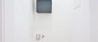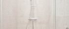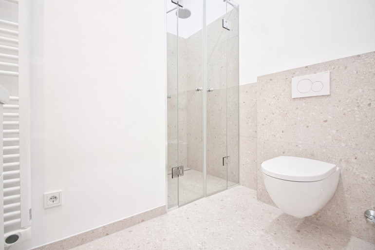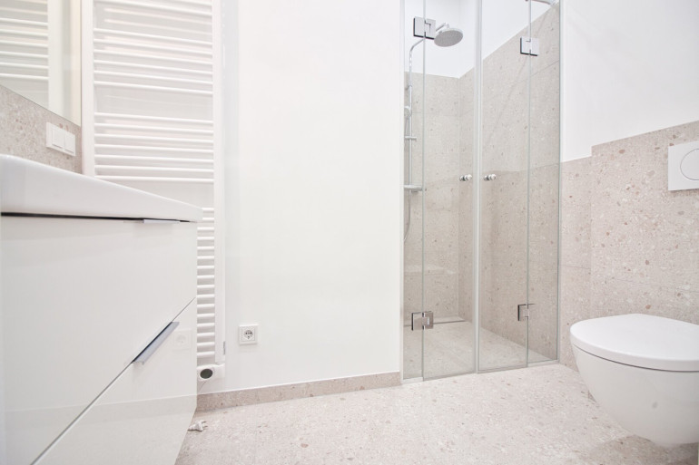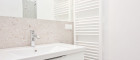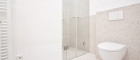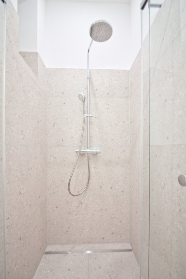 Direkt neben dem Eingang befindet sich das Badezimmer mit bodengleicher Regenwalddusche, Waschtisch mit Unterschrank, einem elektrischen Handtuchheizkörper und einem WC.