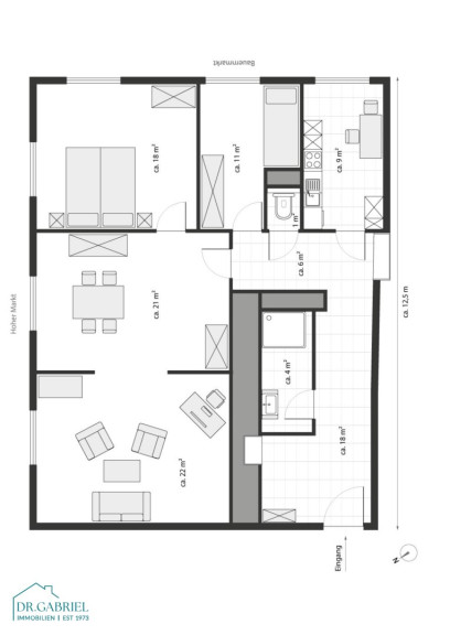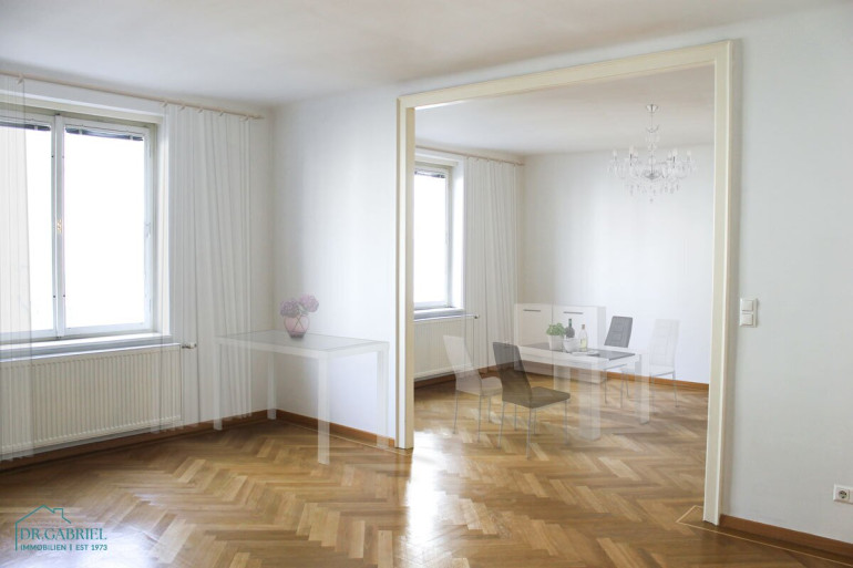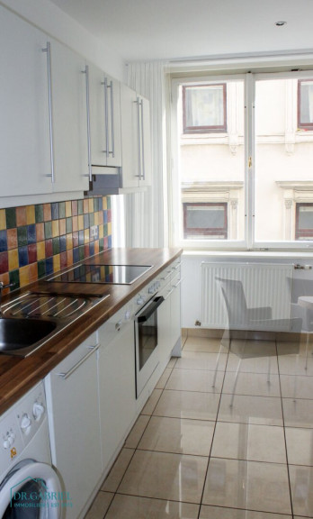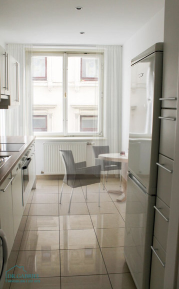 großer Vorraum (18m²) mit viel Platz für die Garderobe, Wohn- und Essbereich (43 m²) mit Blick auf die Anker Uhr, ein großes Schlafzimmer (18 m²) und ein weiteres Schlafzimmer (11 m²), separate voll ausgestattete Küche mit Platz für einen Bistrotisch, Duschbad, Gäste WC