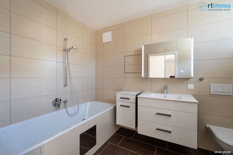 Badezimmer 2: Großzügiges Bad mit Wohlfühlbadewanne, Handwaschbecken, WC und Waschmaschinenanschluss.