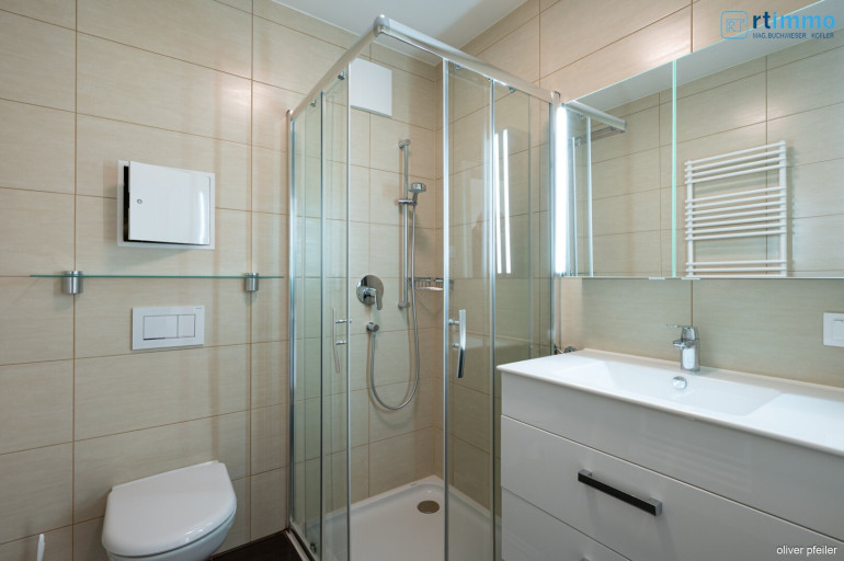 Badezimmer 1: Ausgestattet mit Dusche, WC und Handwaschbecken.