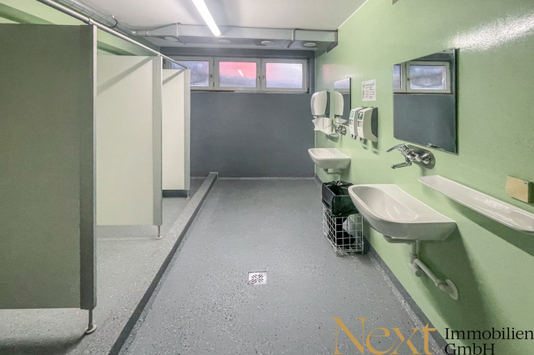 Im Kellergeschoß stehen zusätzlich ca. 200m² Nutzfläche mit Sanitärbereichen, Duschen, Umkleiden sowie Abstellräumen zur Verfügung.
