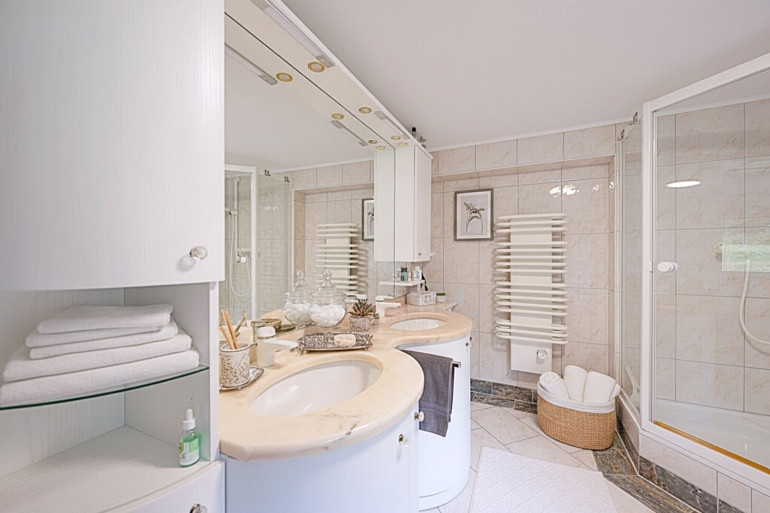 Das Haus bietet insgesamt 4 Schlafzimmer, zwei Badezimmer und ein WC in jeder Etage. Im Obergeschoss befindet sich ein offener Wohnbereich mit großem Esstisch, gemütlichem Kamin und angrenzender Küche. Zudem befindet sich auf dieser Etage ein Kinderzimmer, welches aktuell als Büro genutzt wird sowie eine ausgebaute Loggia, welche sich als Lesezimmer oder dergleichen eignen würde. Im Erdgeschoss befindet sich ein weiteres Wohnzimmer, ebenfalls mit Kachelofen, eine separate Küche, ein Schlafzimmer sowie ein Badezimmer. Somit könnte das Erdgeschoss als eigene kleine Einheit oder zur Vermietung an Feriengäste genutzt werden. Im Dachgeschoss befinden sich zwei Schlafzimmer und ein Badezimmer mit Dusche und Wanne sowie ein Raum zur Lagerung, welcher als Kleiderschrank genutzt wird. Das Haus bietet somit viel Platz und Möglichkeiten, es nach den eigenen Bedürfnissen umzugestalten. Die praktische Ausstattung umfasst zudem zwei Garagen, die nicht nur Platz für Fahrzeuge bieten, sondern auch als zusätzlicher Stauraum dienen können.