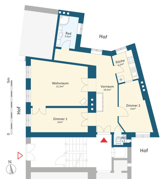 Die Wohnung ist zentral begehbar. Sie verfügt über drei Zimmer, Küche, Duschbad und getrenntes WC. Im Haus gibt es einen Fahrradraum mit straßenebenem Zugang. (Es gehört kein Kellerabteil zu der Wohnung.)