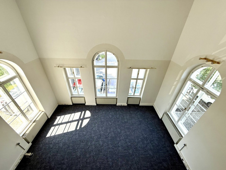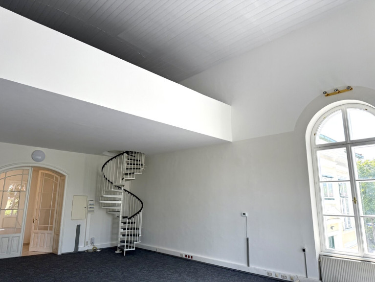 Das Büro verfügt in Summe über drei Räume mit einer Gesamtgröße von 176 m². Im Mittelpunkt steht der repräsentative 80 m² große lichtdurchflutete Raum, inklusive einer 60 m² großen Galerie. Die Raumhöhe ist mit 7 m einzigartig und sucht ihresgleichen.