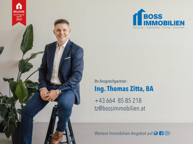 Unverbindliches, freibleibendes Angebot. Informationen nach bestem Wissen und Gewissen vom Abgeber erhalten - für die Richtigkeit wird keine Haftung übernommen. Mündliche Nebenabreden zum angebotenen Objekt bedürfen zu Ihrer Wirksamkeit der Schriftform. Irrtümer, Druckfehler und Änderungen vorbehalten. Besichtigungen und Beratungen erfolgen kostenlos, lediglich im Falle einer erfolgreichen Vermittlungstätigkeit ist die gesetzliche bzw. angeführte Provision in Höhe von 3% des Bruttoverkaufspreises zzgl. 20% USt. zur Zahlung fällig. Der Vermittler ist als Doppelmakler tätig. Es besteht zwischen dem Vermittler und dem Abgeber kein wirtschaftliches Naheverhältnis. Information zum Datenschutz unter www.bossimmobilien.at/datenschutz