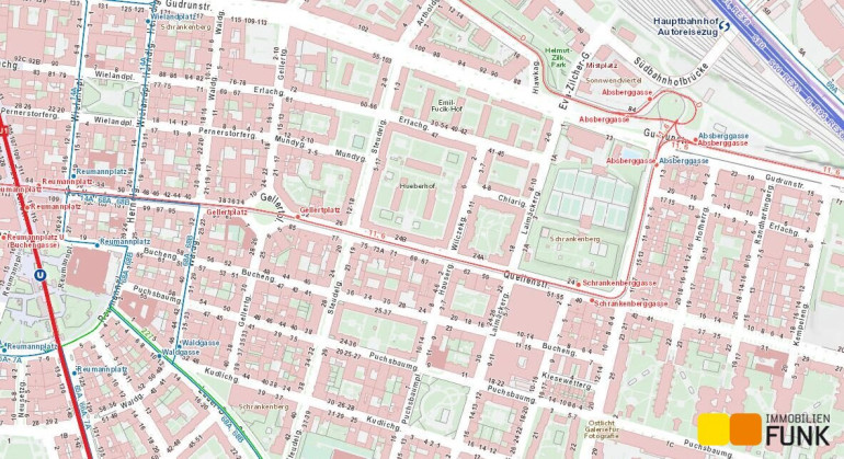 Die Straßenbahnhaltestelle Schrankenberggasse (Linien 6 und 11) erreichen Sie in vier Gehminuten. Etwas weiter in die gleiche Richtung vorbei am Tenniszentrum Faradaygasse und am Kinderbad Gudrunstraße gelangen Sie zur Straßenbahnstation Absberggasse (Linie D), die u.a. zum Hauptbahnhof Wien führt. Die U1 Station Reumannplatz erreichen Sie in fußläufig in etwa 11 Minuten und kommen auf Ihrem Weg beim Amalienbad vorbei. Das Zentrum Wiens, den Stephansplatz, erreichen sie öffentlich mit der U1 in ca. 24 Minuten.