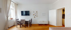 - Heller Wohn-/Schlafraum mit Esstisch, Sofa und Bett