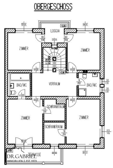 1.STOCK: Vorraum, vier Schlafzimmer, zwei begehbare Garderoben, zwei Bäder, zwei WC, eine Loggia, eine Terrasse