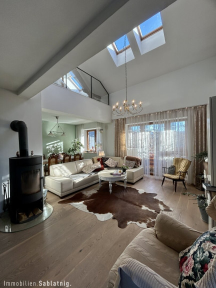Besonders hervorzuheben ist der lichtdurchflutete Wohn- und Essbereich, das Herzstück des Hauses. Hier trifft Gemütlichkeit auf modernes Design. Der offene Luftraum schafft ein großzügiges Raumgefühl, während das ausgebaute Dachgeschoss einen ruhigen Rückzugsort bietet.