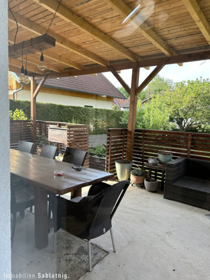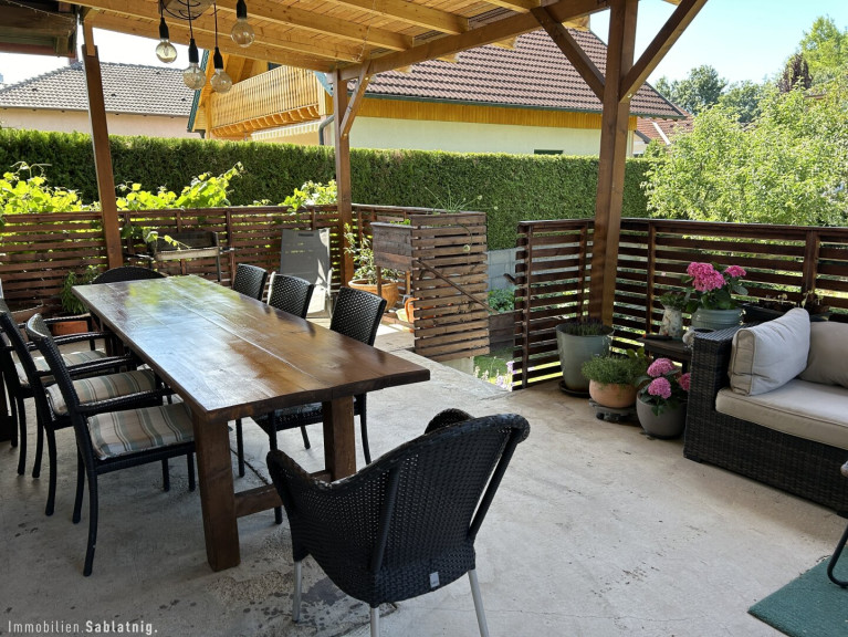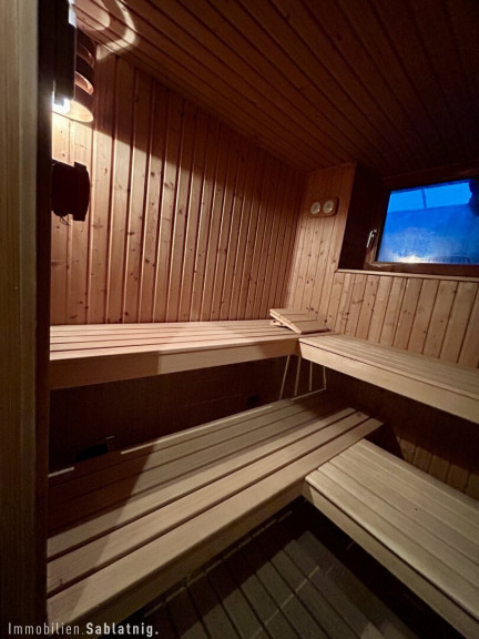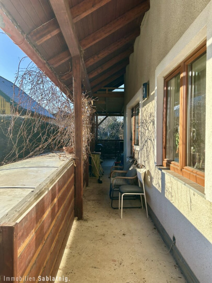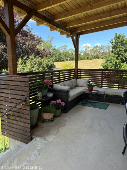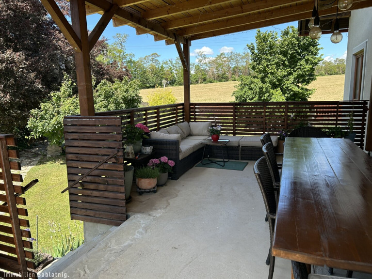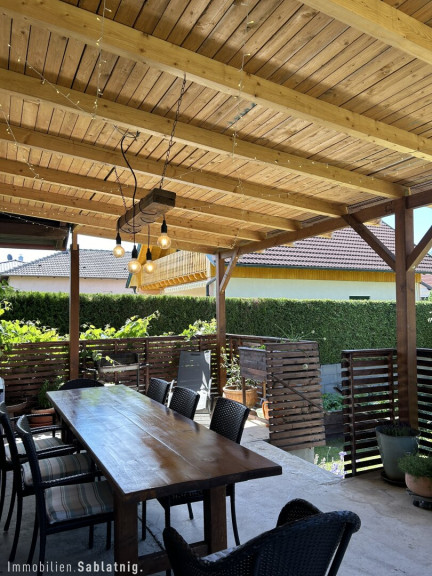 Im Jahr 2022 wurde das Anwesen um eine großzügige, voll überdachte Terrasse mit 40 m² erweitert, die zum Entspannen und Genießen im Freien einlädt. Zudem bietet der Außenbereich eine Sauna für wohltuende Stunden sowie einen befestigten Parkplatz.