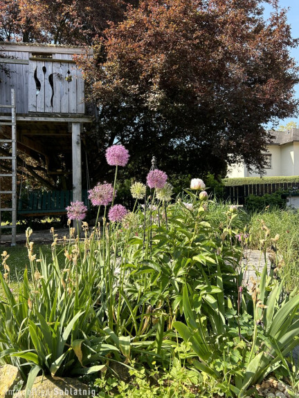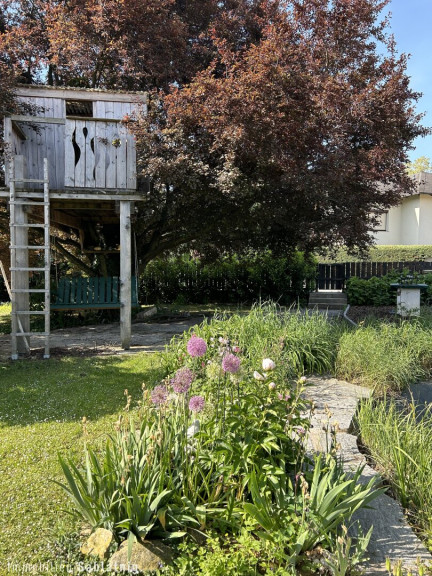 Das weitläufige Eckgrundstück mit freier Sicht in die Natur schafft eine idyllische Atmosphäre. Kinderträume werden hier wahr: Ein liebevoll gestaltetes Baumhaus mit Elektroanschlüssen bietet den kleinen Bewohnern einen eigenen, magischen Rückzugsort.