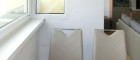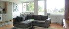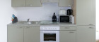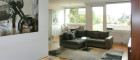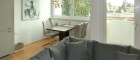 Die Garderobe in zarten Farben, wohlwissend wie es weiter geht. Der Wohnraum offen und extrem hell, das Fensterband zieht sich über die komplette Vorderfront der Wohnung. Links die Küchenzeile, einfach aber gut abgestimmt mit dem Rest, angrenzend der Esstisch, den Blick immer hinaus, als genießen Sie ein Picknick im Freien.