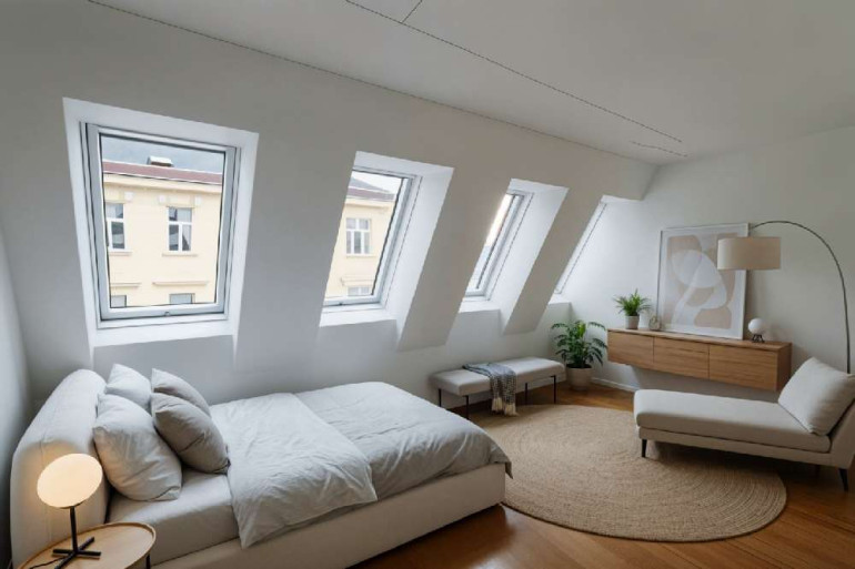 Im neu ausgebauten Dachgeschoss befinden sich insgesamt 6 exklusive Wohnungen, davon 3 stilvolle Maisonettwohnungen. Besonders hervorzuheben ist die Top 23, die mit einer großzügigen Dachterrasse und einem atemberaubenden 360-Grad-Blick über Wien beeindruckt – ein einzigartiges Wohngefühl hoch über den Dächern der Stadt.
