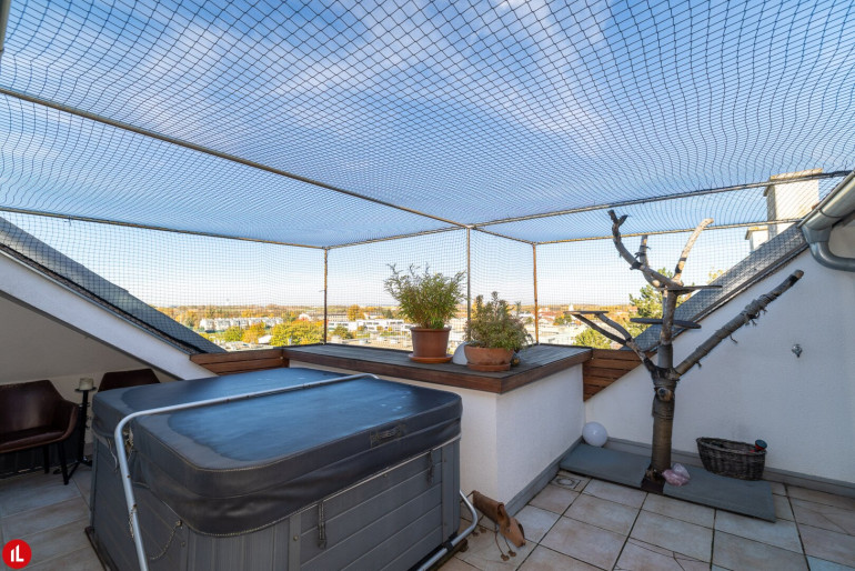 Die beeindruckende Wohnfläche von 148 m² verteilt sich auf vier separat begehbare, große Zimmer und bietet damit Raum für stilvolles Wohnen, Arbeiten und Entspannen. Das zentrale Vorzimmer führt in die elegante Hochglanzküche, die direkt in den großzügigen Wohnbereich übergeht. Von hier gelangen Sie auf die spektakuläre Dachterrasse, die mit ganztägiger Sonne, einem Whirlpool und herrlichem Ausblick begeistert – ein Ort, an dem man den Alltag hinter sich lässt.
