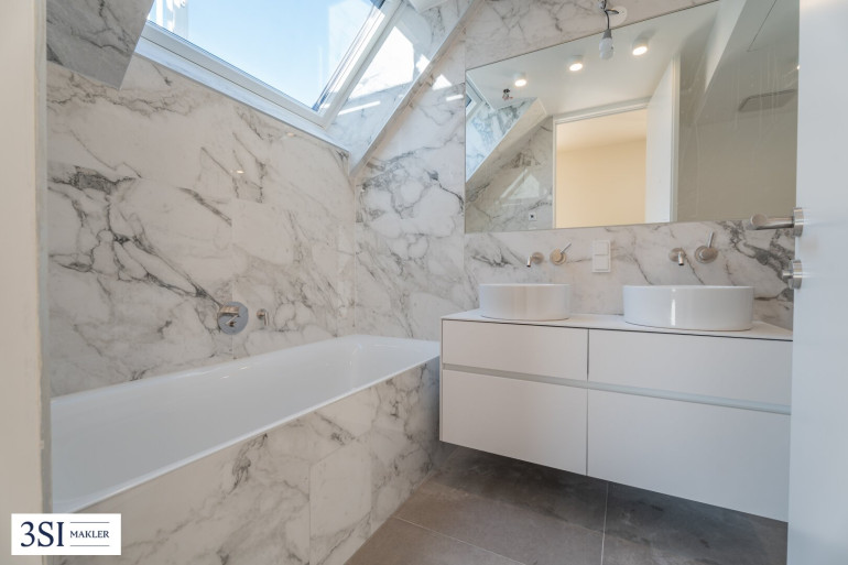 - Badezimmer mit Badewanne, WC, zwei Handwaschbecken und Waschmaschinenanschluss (ca. 5 m²)