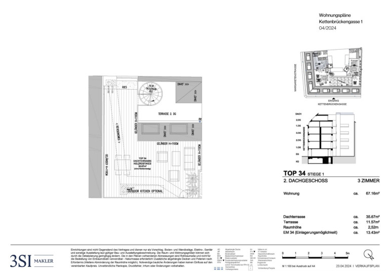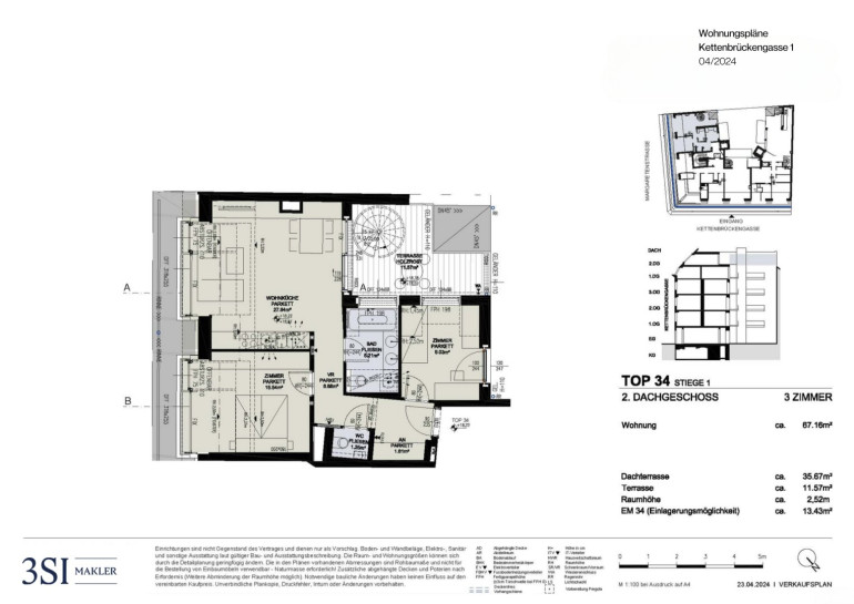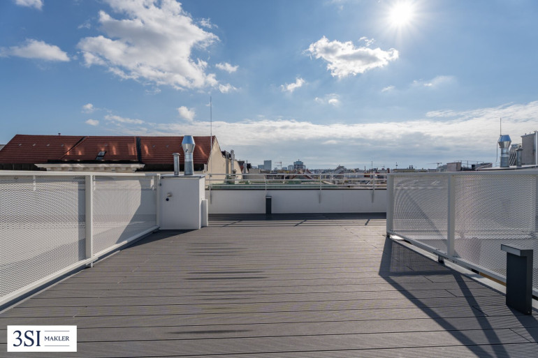 Die 3-Zimmer-Wohnung befindet sich im 2. Dachgeschoss und bietet eine Wohnfläche von ca. 67 m² sowie eine Terrasse mit ca. 12 m² und eine private Dachterrasse mit ca. 36 m².