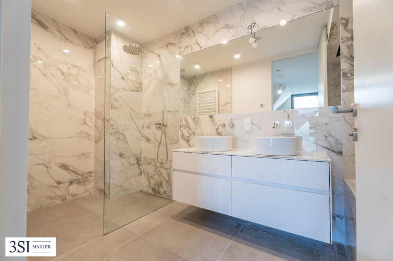 - Badezimmer mit Badewanne, Dusche und zwei Handwaschbecken (ca. 7 m²)
