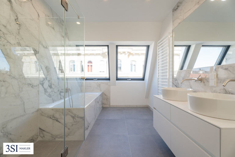 - Badezimmer mit Badewanne, Dusche und zwei Handwaschbecken (ca. 9 m²)