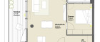 Vorraum, Wohnzimmer + offene Küche (beinhaltet alle Geräte des täglichen Bedarfs), Schlafzimmer, Badezimmer mit Dusche, WC, Kellerabteil, Loggia, Terrasse
