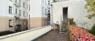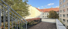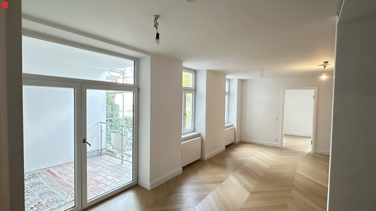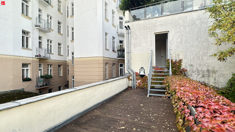 Vom Wohnbereich aus öffnet sich das ca. 16 m² große Schlafzimmer, welches über eine Treppe direkten Zugang zur ca. 23 m² großen Terrasse im Innenhof bietet – ein geschützter Rückzugsort mit besonderem Flair und viel Privatsphäre.