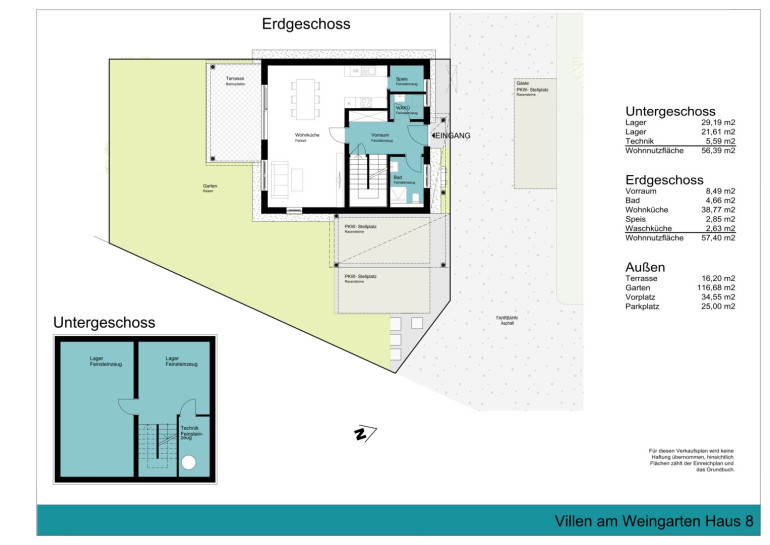 Im Erdgeschoß sind jeweils Vorraum, Bad mit Dusche, Waschbecken und Toilette sowie eine große Wohnküche mit Ausgang auf die überdachte Terrasse und den Garten angeordnet. Die an die Küche angrenzende, mögliche Speis ist für passionierte Hobbyköche sicher das Highlight.
