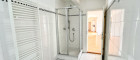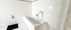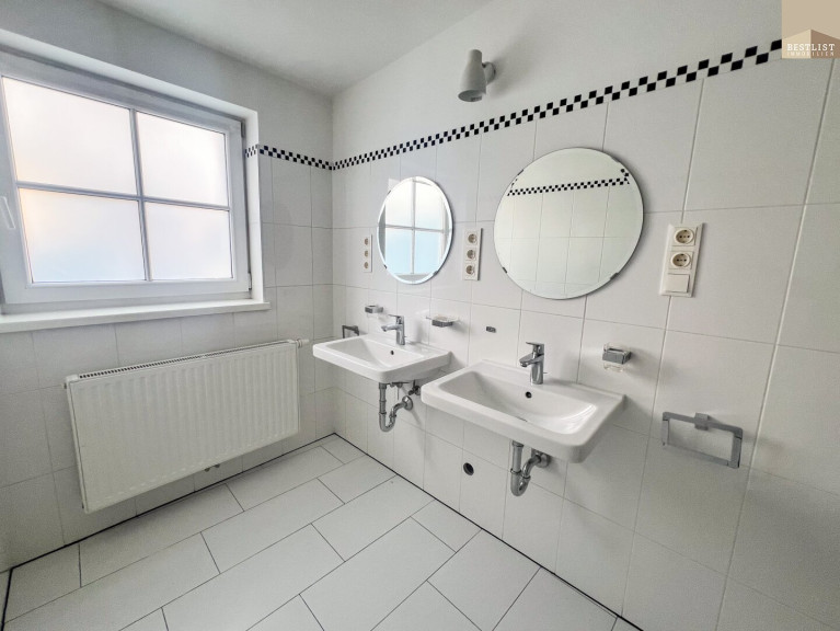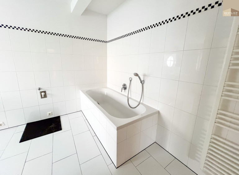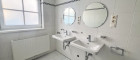 Das Badezimmer ist mit Badewanne, Dusche, Doppelwaschbecken sowie einem Anschluss für die Waschmaschine ausgestattet.