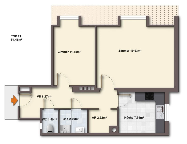 Wohnzimmer 19,93m², Schlafzimmer 11,15m², Küche 7,79m², Vorzimmer 8,47m², Bad 2,70m², AR 2,92m², WC 1,50m²