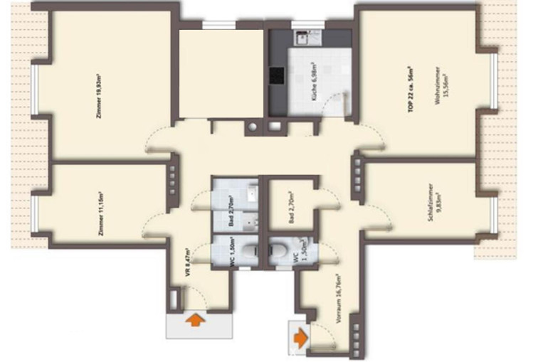 Es handelt sich um zwei nebeneinanderliegende Wohnungen, wobei Top 22 sofort bezugsmöglich ist. Die Top 21 ist teilweise zu sanieren nämlich Wohnzimmer, Schlafzimmer sowie die Küche die zu einem zusätzlichen Wohnraum umfunktioniert werden kann. Die Wohnungen sind technisch leicht zu verbinden, sodass Sie eine 5 Zimmerwohnung mit 2 Bädern, und 2 WC herstellen können.