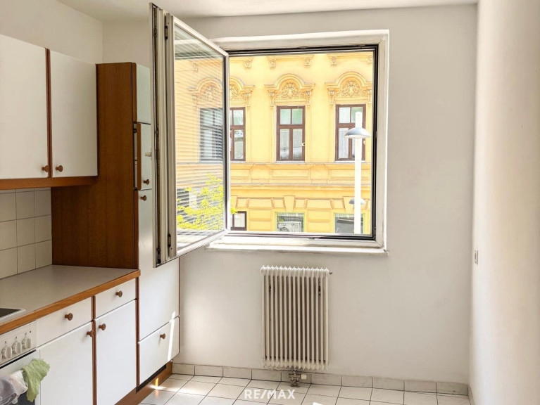 Sie verfügt über zwei großzügige Zimmer, ein Vorzimmer mit praktischen Stauraummöglichkeiten, ein separates WC sowie eine getrennt begehbare Küche mit Fenster in eine Seitengasse.