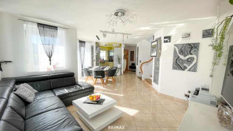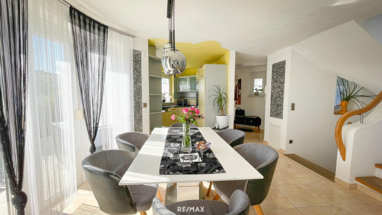 großer Wohn-Essraum (ca. 29 m²) mit Ausgang auf die Terrasse mit Gartenblick