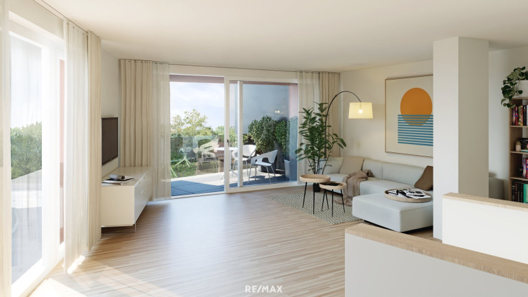 2. OG: Ca. 44,83 m² Wohnküche mit Zugang zu 2 Terrassen, Zimmer, separate Toilette, Abstellraum, Aufzug, 2 Terrassen (ca. 29,22 m² u. 13,83 m²)