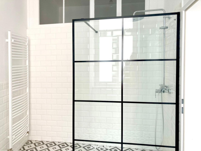 • Charmanter Mix aus Fischgrätparkett (Wohnbereiche) & Vintage-Fliesen (Nassbereiche)