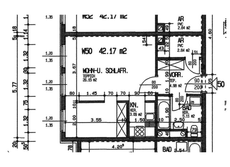 • Effiziente Raumaufteilung: Der Grundriss zeigt eine klare Trennung zwischen Wohn-, Küchen- und Nassbereichen, die eine optimale Nutzung der ca. 50 m² ermöglicht.