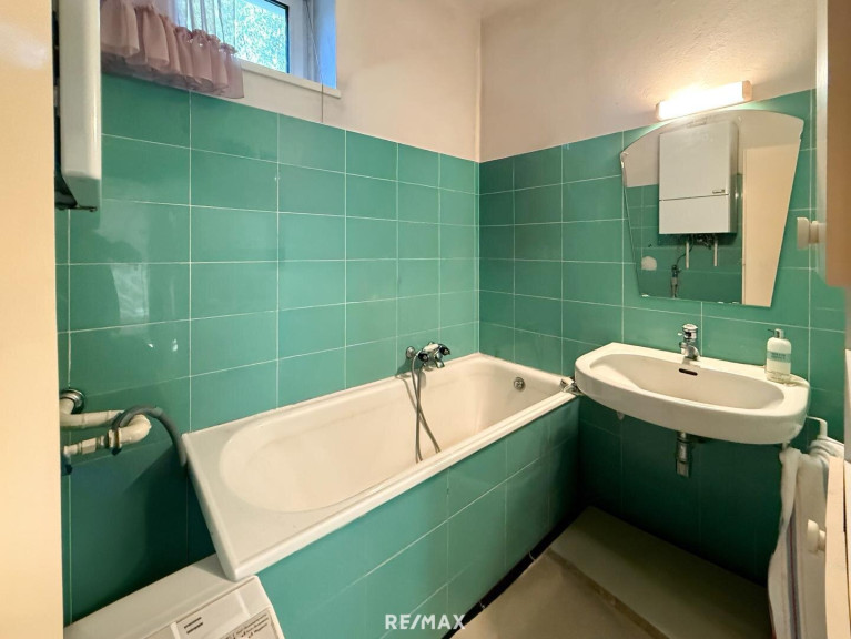 * Badezimmer mit Wanne und Waschbecken, Therme und Waschmaschinenanschluß