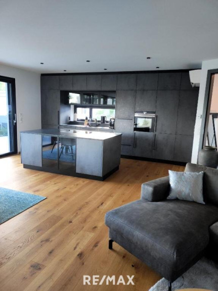Die maßgefertigte Tischlerküche mit hochwertigen Geräten, großzügigen Arbeitsflächen und viel Stauraum fügt sich harmonisch ins Raumkonzept ein – perfekt für gesellige Abende oder das private Dinner zu zweit.