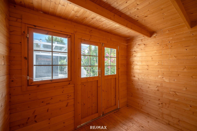 Ein wahrliches Highlight ist der Garten - ausgestattet mit einem Schwimmspa ( ca. 7500l) mit Gegenstromanlage von EUTECH und einem Sauna Häuschen (Platz für 3 Personen) findet man hier Ruhe und Entspannung vom Alltag . Auch für Hochbeete und Pflanzen ist genug Platz - die Autos finden vor dem Haus am Grundstück unter dem Car Port Platz (das Einfahrtstor öffnet elektrisch per Fernbedienung) und sind vor Wind und Wetter geschützt. Vor dem Haus steht dem neuen Eigentümer ein Gartenhaus viel Stauraum zu Verfügung. Der Garten ist 2020 mit einem hochwertigen Steinteppich aus Marmorkiesel ausgelegt worden.