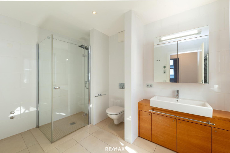 Neben dem Wohnsalon bietet die Wohnung ein Schlafzimmer, das sich ruhig zur Rückseite orientiert. Ergänzt wird der Grundriss durch ein Badezimmer mit Glasdusche, ein separates WC, eine Garderobe sowie einen praktischen Abstellraum – kompakt organisiert und durchdacht auf einer Ebene.
