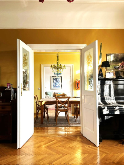 Ein zentraler Korridor führt zum Stiegenaufgang. Im ersten Stock befindet sich der Wohnungseingang. Hier gibt es 4 Zimmer. Das geräumige Vorzimmer bietet Zugang zu einem der beiden gestaltungsthematisch unterschiedlichen Wohnsalone, zum Esszimmer (mit Balkon), zum Schlafzimmer sowie in die separate Küche (Einbauküche mit allen Geräten). Der zweite Wohnsalon ist vom Esszimmer sowie vom Schlafzimmer aus zu betreten, das Schlafzimmer ist sowohl von zweiten Wohnsalon also auch dem Vorraum zu betreten. Die beiden Wohnsalone sowie das Esszimmer mit dem charmanten Balkon sind straßenseitig angeordnet. Das Schlafzimmer ist gartenseitig (Rückseite) ausgerichtet. Ein WC mit Waschbecken ist vom Vorraum aus zu betreten.