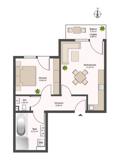 Die durchdachten Grundrisse bieten 2 bis 3 Zimmer auf rund 42–66 m² Wohnfläche. Jede Wohnung verfügt über großzügige Terrassen oder Balkone, im Erdgeschoss auch über eigene Gärten. Ein Kellerabteil ist im Kaufpreis inkludiert, Tiefgaragenplätze sind optional verfügbar.