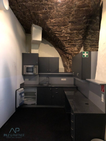 Die Raumeinteilung ist sehr variabel. Aktuell ist eine große Küche mit Aufenthaltsbereich vom eigentlichen Verkaufs- bzw. Arbeitsraum abgetrennt; eine Zusammenlegung ist aber auch denkbar.