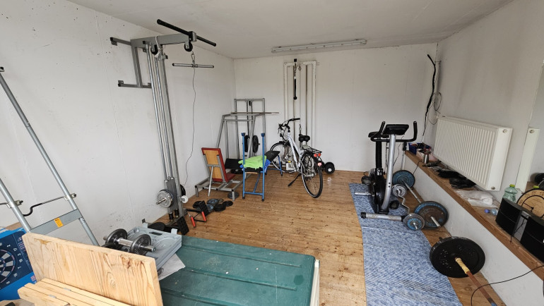 - Untergeschoss (ca. 120m2): Keller mit Heizraum (Öl-Zentralheizung auf Holz umschaltbar), Saunaraum mit Dusche, Sportraum mit Fitnessgeräten, Garage für 2 PKW geeignet.