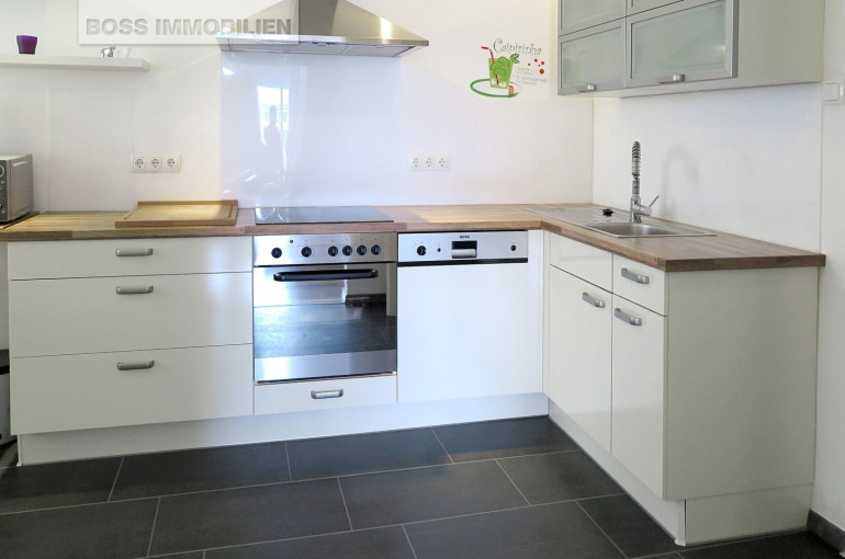 Schon im großzügigen Vorraum finden Jacken, Schuhe und Accessoires bequem Platz. Von hier aus gelangen Sie direkt in die hochwertig ausgestattete Küche mit edlen, hellen Fronten und kontrastreichem Boden. Ob schnelles Frühstück an der eleganten Theke oder gemeinsames Dinner im angrenzenden Wohn- und Essbereich – hier macht Kochen und Genießen gleichermaßen Freude. Auf einer gemütlichen Couch entspannen Sie anschließend vor dem Fernseher.