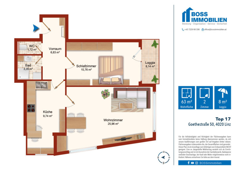 Die Wohnung befindet sich in der Goethestraße – einer Lage, die urbanes Leben mit praktischer Nähe zu allem Wichtigen verbindet. In nur wenigen Schritten erreichen Sie den Südbahnhofmarkt, wo Sie frisches Obst, Gemüse und Dinge des täglichen Bedarfs einkaufen können. Einen Supermarkt oder eine Bäckerei befindet sich auch in der Nähe. Auch die nächste Bushaltestelle ist schnell erreichbar: mit den Linz Linien gelangen Sie bequem in alle Richtungen der Stadt. Falls Sie mit dem Auto unterwegs sind, haben Sie zudem die Möglichkeit, eine Bewohnerkarte der Stadt Linz zu nutzen und Ihr Fahrzeug komfortabel in der Umgebung zu parken.