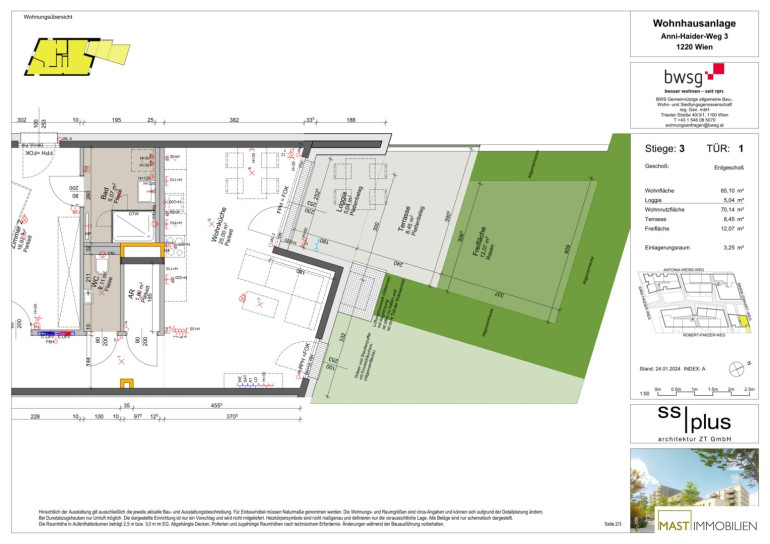 Die Wohnung befindet sich im Erdgeschoss und verfügt über 65,10 m² Wohnfläche + eine 25,56 m² große Freifläche.