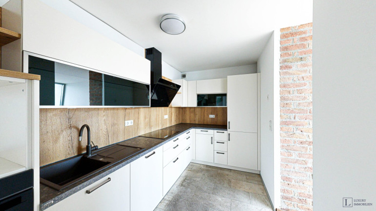 Die untere Ebene überzeugt mit einem offenen Wohn- und Essbereich samt Küche und Terrassenzugang, einem Schlafzimmer sowie einem modernen Bad mit Dusche und WC.