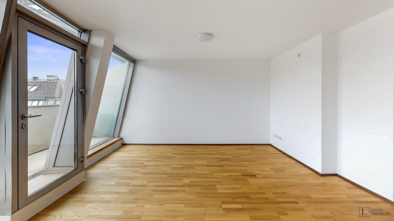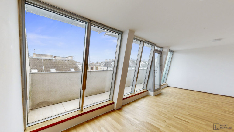 Diese elegante Maisonette-Wohnung erstreckt sich über die obersten Etagen eines Wohnhauses im 14. Wiener Bezirk – direkt gegenüber dem prachtvollen Schloss Schönbrunn.